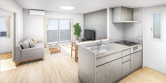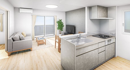 ※掲載の完成予想CG(外観・内観)は計画段階の図面を基に描き起こしたもので形状・色等は実際とは異なります。なお、外観形状の細部、設備機器等については、表現しておりません。形状、仕様、外構等については行政官庁の指導及び、設計・施工の都合により変更が生じる場合がありますので、予めご了承ください。
