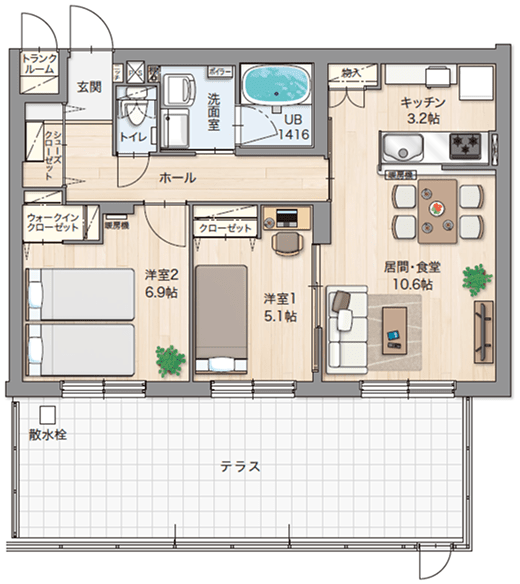 傷がつきにくいクロスを採用し、専用テラスはペットと一緒にのびのび遊べる空間です。大切な家族と快適に暮らせる、上質な住まいをご用意しました。